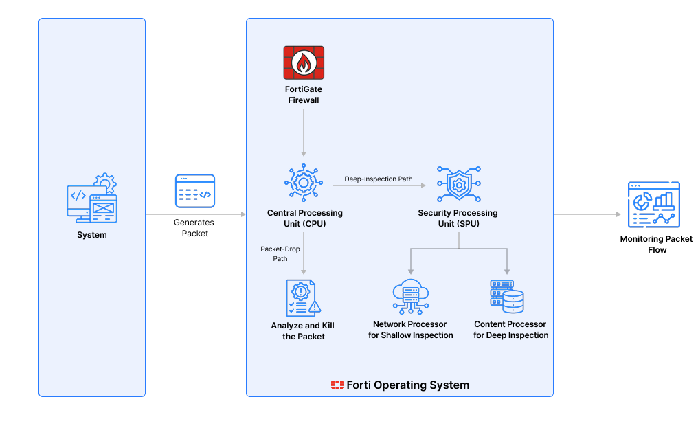Fotigate’s Security Processing Unit (SPU) then decides how the traffic should be processed. Based on your configuration, the SPU routes the packet either to: