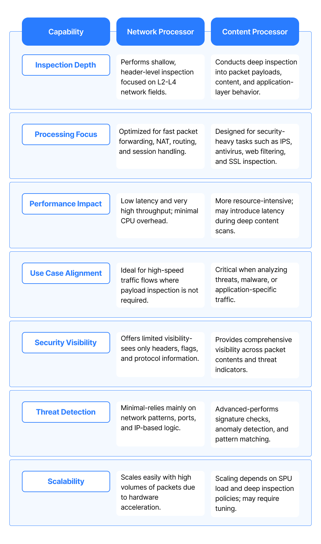 SPU serves as a decision-making component of Fortinet's hardware architecture and decides whether the packet should be operated by NP or CP. Together, they accelerate traffic flow, enforce security policies, and enable FortiGate’s high-performance inspection.