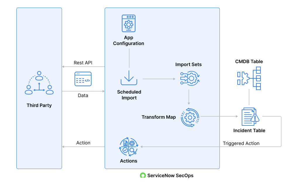 The step-by-step architecture above provides a detailed understanding of how ServiceNow SecOps integration effectively manages and handles data exchange between different third-party platforms.